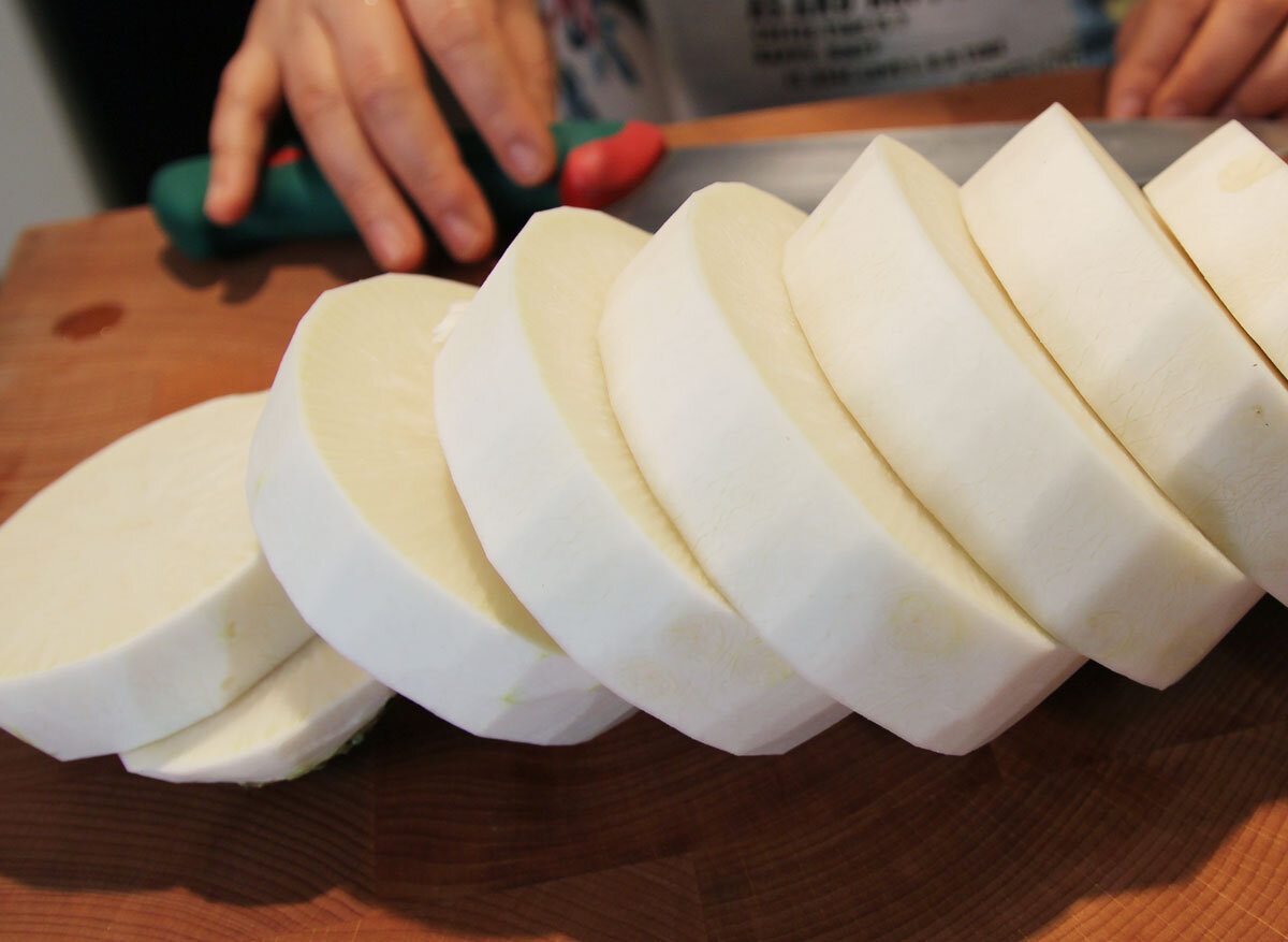 Ккакдуги - это разновидность кимчи, приготовленного из нарезанной кубиками редьки. Это очень распространенный вид кимчи и часто используется в корейских повседневных блюдах наряду с кимчи из пекинской капусты. Ингредиенты: • Корейская редька (или дайкон) 1.8 кг, • Зелёный лук 4 стебля, • Чеснок 5-6 зубчиков, • Редисковый сок 80 мл, • Красный перец 70 г, • Рыбный соус 4 ст. л, • Соль 2 ст. л, • Сахар 2 ст. л, • Имбирь 1 ч. л. Очистите редьку от кожуры. Промойте её в холодной воде и протрите насухо. Нарежьте её на 2-2.5 см кубики и положите их в большую миску. Добавьте соль, сахар и хорошо перемешайте. Дайте редьке настояться 30 минут и слейте выделившийся сок в небольшую миску. Мелко измельчите чеснок, имбирь, зелёный лук. Затем добавьте их к редиске вместе с соусом, красным перцем и редисковым соком. Хорошо перемешайте, чтобы равномерно распределить специи. Положите ккакдуги в стеклянную банку и надавите на него сверху, чтобы удалить весь воздух. Вы можете съесть его сразу же или д