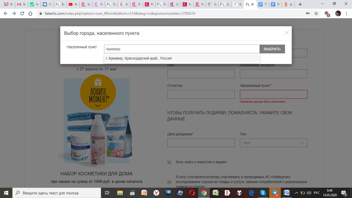 - далее укажите день, месяц, год рождения, из выпадающего списка выберите мужской или женский пол, чтобы получать подарки от Faberlic;