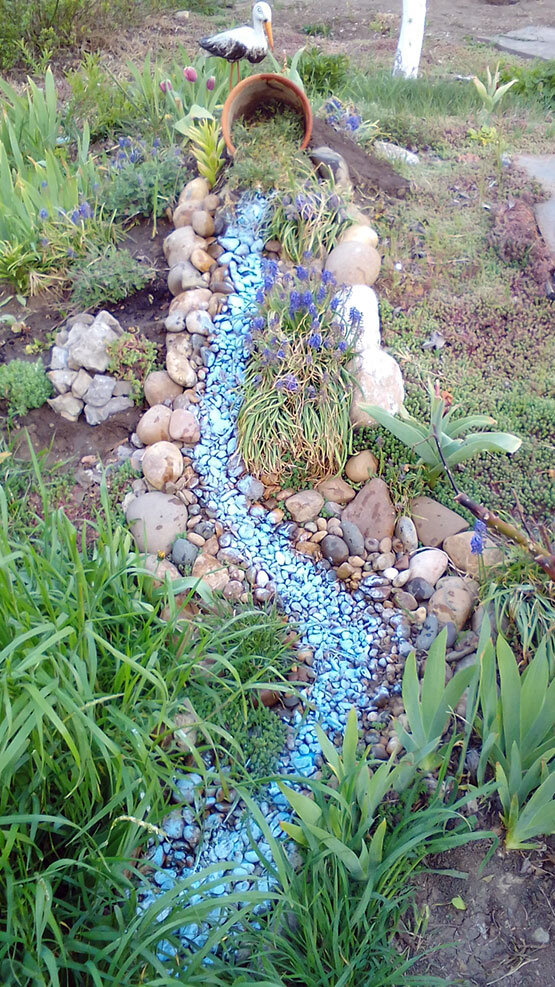 Идею создания декоративного пруда, расположенного в уголке отдыха, я давно вынашивала в голове. Построить большой пруд не представлялось возможным ввиду отсутствия лишних средств и свободной земельной площади, а маленький – опасалась, что при летних температурных условиях велика вероятность быстрого заболачивания. Пересмотрев в Интернете много статей о принципах построения и ухода за летним водоемом, ограничилась оптимальным «дешево, но сердито». Так мне пришла мысль о создании сухого ручья.