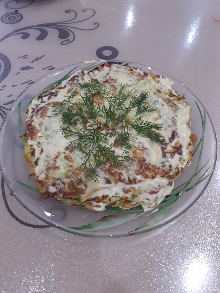 Кабачковый торт - это очень вкусная весенняя закуска. Готовится очень легко и быстро. В моей семье съели за раз. Чеснок, который присутствует в рецепте, наверное поднимает аппетит. Но, если у вас есть детки чеснок нужно положить очень -очень мало, только для запаха. Мои детки в первый раз отказались есть с чесноком, сказали очень остро для них. Так что, если будете готовить - учтите этот факт. Теперь я готовлю 2 порции, одну для взрослых, а одну для детей. Итак, начнём. Для кабачковых блинов нам понадобится : 1 кг кабачков 2 яйца 4 столовые ложки муки Укроп, соль и чёрный перец. Для начала кабачки нужно почистить от кожуры (можно и не чистить, но мне больше нравится очищенные, так вкус будет нежнее), затем натереть на терке, посолить и отложить на 5-10 минут, чтобы кабачки выпустили сок. Затем, выжимаем сок, добавляем яйца, муку, укроп и перец. Хорошо перемешиваем и начинаем жарить блины. Сковороду смазываем маслом (если у вас с антипригарным покрытием, не нужно смазывать) выкла