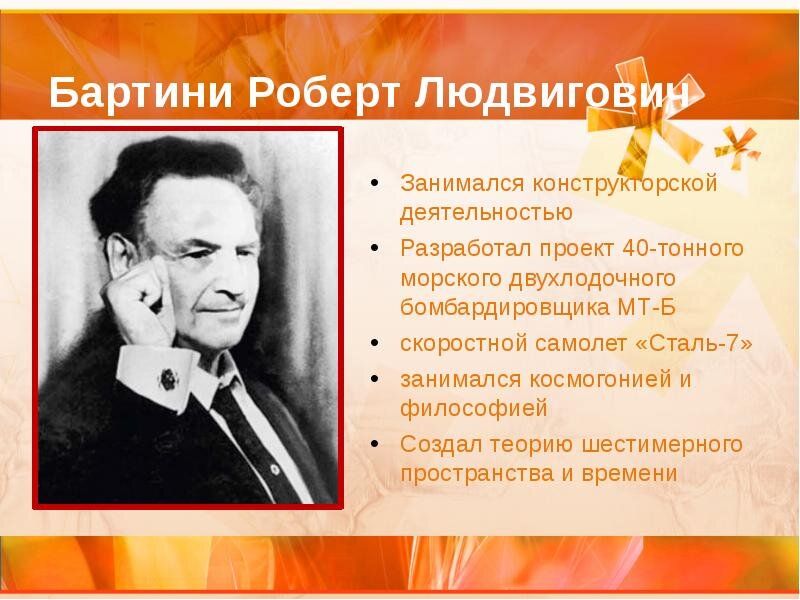 Роберто Лю́двигович Барти́ни, итальянский аристократ (родился в семье барона), коммунист, уехавший из фашистской Италии в СССР, где стал известным авиаконструктором, родился 14 мая 1897 г. в г. Фиуме, Австро-Венгрия. Физик, создатель проектов аппаратов на новых принципах. Автор более 60 законченных проектов самолётов. Комбриг. В анкетах, в графе «национальность» писал: «русский»1.
