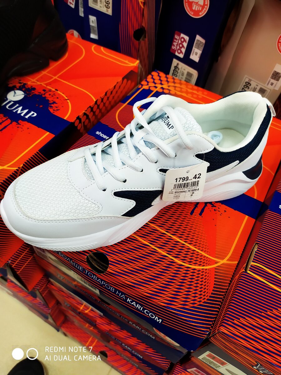 Зашёл сегодня в магазин обуви KARI и был приятно удивлён, когда девушка продавец сказала мне, что началась распродажа всего ассортимента и ещё 30% скидки на прошлые скидки.Получается, что в общем выходит 50-60% от цены на товар.Много ценников ещё не переделано, так , как магазин только открыли после самоизоляции.Но это дело поправимое и надеюсь в следующий раз, цены я увижу более корректными.А в этом обзоре хочу предложить вам к просмотру качественные и хорошие кроссовки для мужчин и женщин, где цена по новым скидкам выходит чуть выше 1000 рублей.И начну с мужских моделей. Мужские кроссовки белого цвета с чёрной вставкой мягкие и лёгкие.Цена со скидкой 1260 рублей. Мужские кроссовки комбинированного цвета.Цена 1049 рублей. Стильные чёрные кроссовки на толстой подошве.Цена 840 рублей. Модные и стильные комбинированные кроссовки с шипованной подошвой яркого жёлтого цвета.Цена 1190 рублей. Кроссовки комбинированного цвета.Цена 1260 рублей. Высокие женские кроссовки комбинированного цвета.
