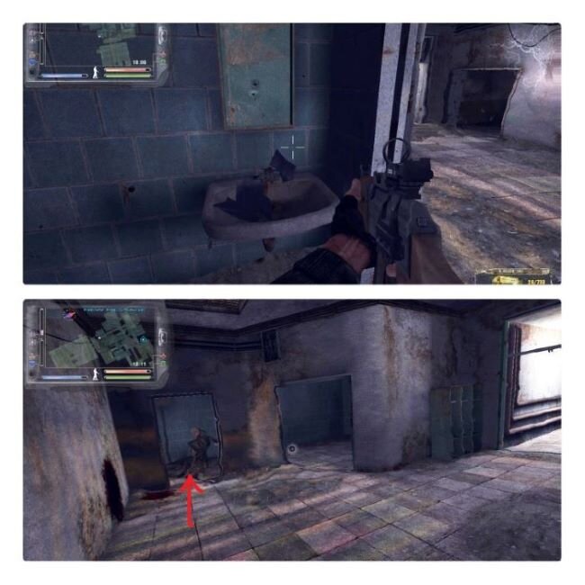 Как только мы заходим в лабораторию Х18 то в закутке лежит труп сталкера с запиской. Если внимательно ее прочитать то можно узнать, что есть еще одна записка спрятанная в самой лаборатории х18. Только из подсказки у нас есть «..свет мой зеркальце скажи..» Становится очевидно, что это связанно с зеркалами. Идем к зеркалу, что находится рядом с трупом ученого который дает первый код к двери (в соседней комнате, туалете). Разбиваем зеркало и нам выпадает очередная записка с подсказкой. В ней говорится о каком-то монстре, что есть на баре, которому командир доверил свою тайну. Идем в Бар, проходим на базу «Долга» и спускаемся в штаб Воронина. У него на стене висят чучела мутантов. Нам нужна голова кабана. Прицеливаемся в районе клыка и вытаскиваем очередную записку. Достать ее достаточно трудновато, нужно правильно прицелиться. В записке указано примерное местоположение тайника с добром. «На Болотах, недалеко от железнодорожных путей, утопил бочку с добром...» Искать где это место