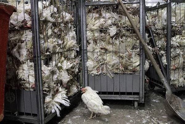 Жизнь в длинных, тесных и пыльных, наполненных аммонием сараев без окон, система интенсивного выращивания приводит кур к тяжелым физическим и психическим стрессам.