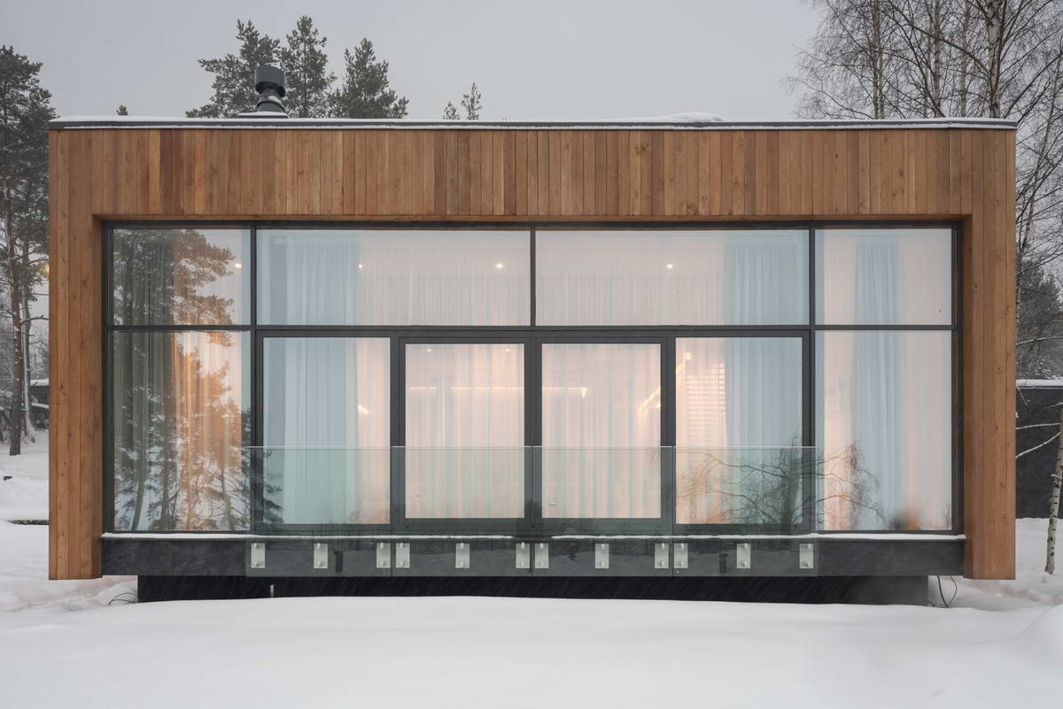 Реализованный проект частного жилого дома находится на участке, расположенном в непосредственной близости к берегу Финского залива с сильно выраженным рельефом и завораживающим видом на водную акваторию. За счет сильного «ступенчатого» рельефа, со средним перепадом высот в 3 – 3,5 метра, было предложено «врезать» одноэтажные объемы зданий в существующий склон, один над другим. Соответственно основной объем здания, площадью 250 квадратных метров и Г-образный в плане, расположился максимально высоко по склону, рядом с зоной въезда на участок, где одна из стен выполнила роль подпорной стены верхней террасы лесного массива.