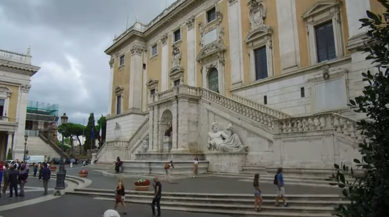 Капитолийская площадь своим видом обязана Великому мастеру Микеланджело Буанарроти, который спроектировал ее в 16 веке. В 1538 году сюда перенесли большую бронзовую статую Марка Аврелия из Латеранского дворца и установили в центр будущей площади, доступ к которой с западной стороны осуществлялся через грандиозный и удобный вход, спроектированный Буонарроти. Статуя Марка Аврелия с новым мраморным основанием, сделанным Микеланджело, становится центральной. Она, по замыслу Мастера, связала между собой архитектуру трех полностью реконструированных зданий: Palazzo Senatorio на заднем плане - Палаццо деи Консерватори справа (отреставрированный в 1563 году и завершенный в 1568 году Джакомо делла Порта) и будущий Палаццо Нуово (позднее построенный перед Палаццо деи Консерватор Джероламо и Карло Райнальди, между 1603 и 1630 годами). Последние два здания спроектированы по слегка расходящимся осям в направлении центральной перспективы от здания Сенаторов. Они соединяются с площадью великолепно