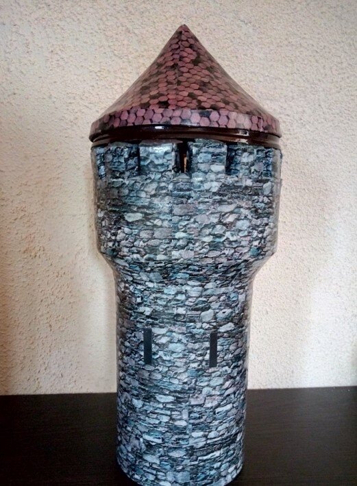 А вот и третий вариант исполнения средневековой башни для солдатиков! И, как обычно, ничего сложного в создании такой игрушки своими руками нет, - было бы желание! Смотрите сами: За основу мы, как и в прошлый раз (смотри статью про Круглую башню), взяли круглую жестяную «подарочную» банку из-под чая. Утолщение в верхней части добились путём наклеивания гофрокартона (вырезали полосы из коробки от микроволновки) в четыре слоя. Скос- перепад между верхней и нижней частями создали ещё одной полосой того же гофрокартона. Высота башни составляет 240 мм, диаметр верхней части 130 мм. Бойницы наверху башни разметили и прорезали отрезной машинкой (болгаркой), затем эти прорезы промазали, для прочности, клеем «Поксипол» (куда ж без него!))) Для вящей прочности вырезали кольцо из крышки от литрового ведёрка из-под майонеза, и приклеили его поверх бойниц. Ещё одно такое же кольцо – в основании конуса крыши. Таким образом крыша нашей башни получилась съёмной, но при этом не соскальзывает случайно