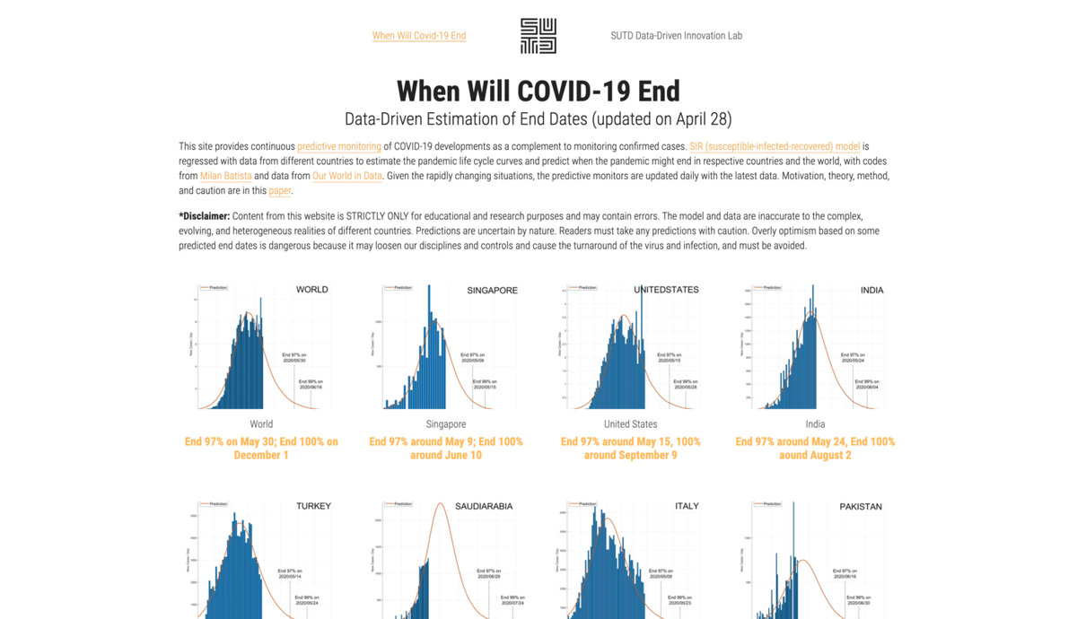 Ресурс предлагает посмотреть, когда — с различной степенью вероятности — наступит конец пандемии Covid-19 в разных странах. Правда, создатели сайта предупреждают, что их данные могут быть неточны и не учитывают все возможные факторы. Группа ученых из Сингапурского университета технологий и дизайна и лаборатории Data-Driven Development Lab под руководством профессора Цзяньси Луо из Массачусетского технологического института попыталась привнести немного больше определенности, основанной на математических моделях. Собрав данные по новым зарегистрированным случаям заболеваний в разных государствах, исследователи составили наглядные прогностические кривые, которые показывают, когда в той или иной стране может закончиться волна пандемии. Эти графики они опубликовали на специальном веб-сайте. Для построения прогнозов была использована так называемая SIR-модель (Susceptible — Infected — Recovered). Она учитывает восприимчивых, инфицированных и уже переболевших индивидов в определенные моменты