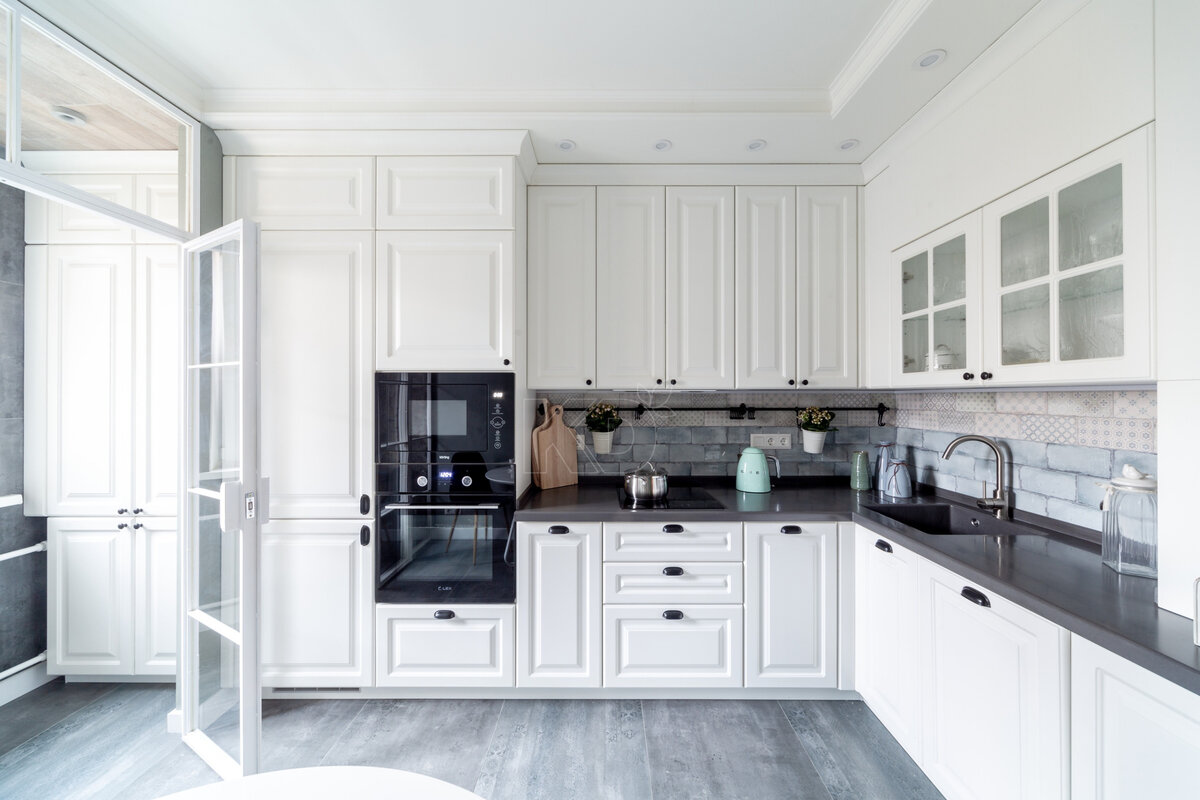 Как правильно спроектировать кухню 12 кв.метров? Кухня – серьёзное приобретение, к которому лучше отнестись ответственно. Александр Ежов и его супруга поступили именно так! Свою кухню они начали искать примерно за год до получения ключей от новой квартиры. Семья посетила множество салонов, среди которых оказался и салон «Кухонный Двор». И именно нашей компании выпала честь создать для супругов кухню, о которой они мечтали! А мечтали они об изящной и благородной классике! Выбор был сделан в пользу модели «Катарина» с фасадами из MDF, покрытой экомембраной. Это инновационное покрытие надёжно защищает кухню от вредных воздействий влаги, солнечного света и высоких температур. При этом экомембрана позволяет кухне «дышать», обеспечивая прекрасный тепло- и газообмен с внешней средой. Ультрасовременные материалы и классическая внешность – идеальное сочетание! На внешности хочется остановиться отдельно. Контраст чёрного и белого очень к лицу «Катарине». Светлые фасады делают