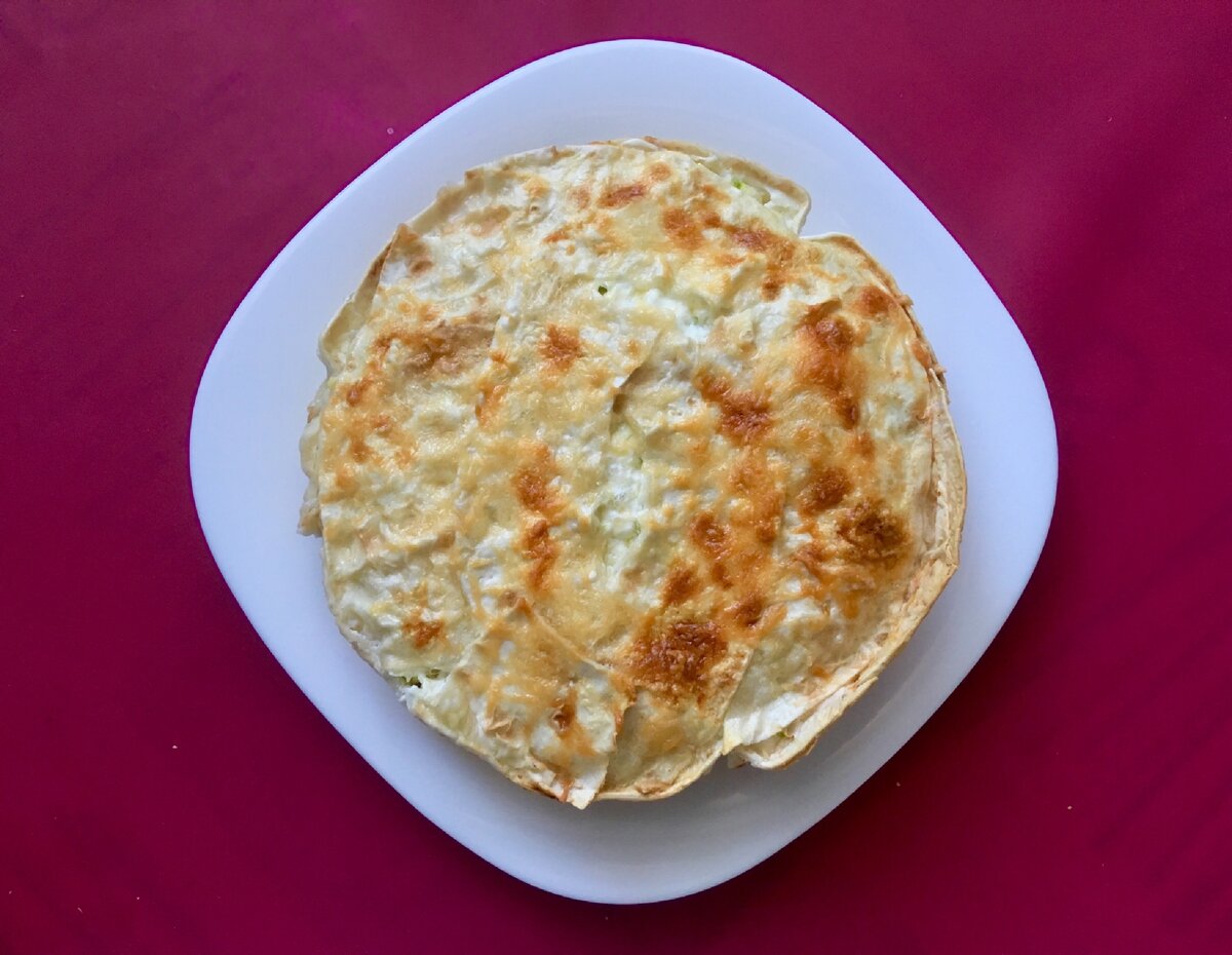 Вместо теста использую тонкий лаваш. У меня лаваш круглой формы, один лист весит всего ~35 грамм.