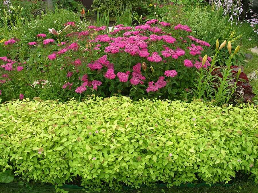 Спирея «Gold Mound»- карликовый, 0,25 м высотой, куст с ярко золотисто-желтой листвой и мелкими соцветиями розовых цветков, появляющиеся в середине июля.