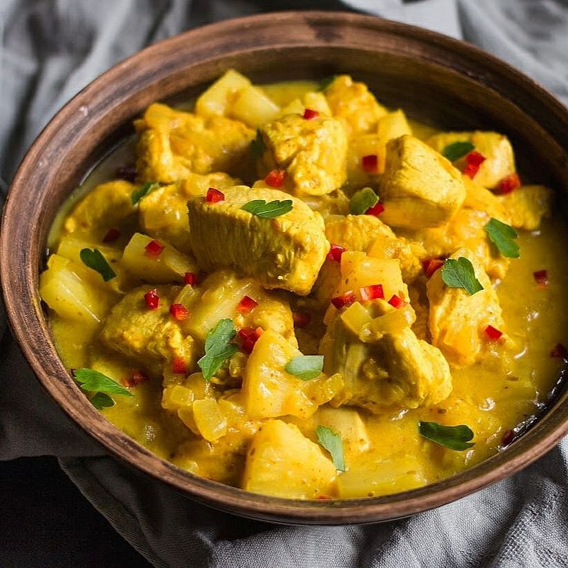 2)Лук репчатый нарезаем кубиком, обжариваем до прозрачности и добавляем измельчённые чеснок, имбирь и чилли, жарим на слабом огне. Как только даст аромат добавляем курицу нарезанную кубиком, слегка обжарим и добавляем все специи ( можно добавить кайенский перец).