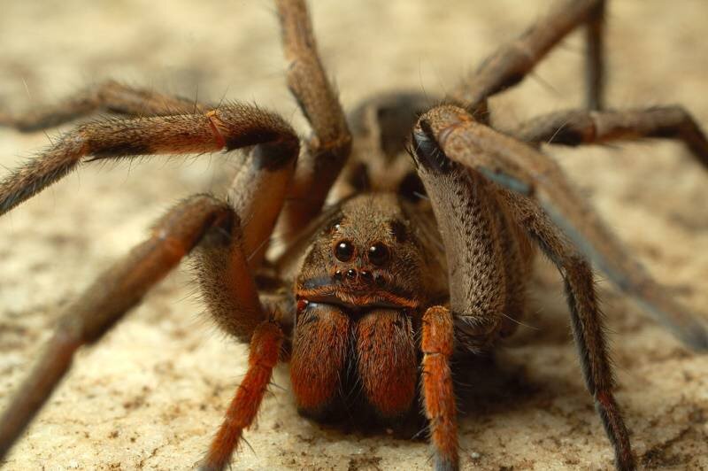- Головогрудь, покрытая панцирем из хитина, с четырьмя парами длинных суставчатых ног. Кроме них здесь расположена пара ногощупалец (педипальп), используемых половозрелыми особями для спаривания, и пара коротких конечностей с ядовитыми крючками – хелицерами. Они являются частью ротового аппарата. Количество глаз у пауков колеблется от 2 до 8.