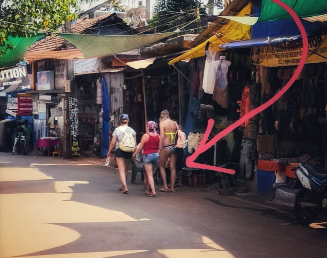 В сезон туристов в Гоа такую картину можно наблюдать часто. Девушка идет по улице в купальнике. Не по пляжу или в кафе, а по деревне. Может даже рискнуть и зайти в магазин, тем самым шокировать всех. Не факт, что ее обслужат. Большинство индийцев просто молча смотрят и все еще удивляются. Для них это просто не прилично. Местные конечно же привыкли к подобным ситуациям. Русские туристы просто не видят разницы между Турцией, например и Индией. А приезжие из других штатов Индии, в которых женщины прикрывают колени и плечи, при виде полуголых женщин просто теряют дар речи. Впрочем, некоторые быстро включаются и бегают за жертвой, фотографируя вид сзади и пытаясь познакомится. Некоторым дамам все равно и они демонстративно идут с гордо поднятой головой. Других пугает такое поведение, ведь они не ожидали, что в Индии так. Вообще, гулять в купальнике в Гоа не принято. Возможно девушки об этом не знают. Даже на пляже в разгар сезона дикие индийцы из южных штатов преследуют девушек в очень наг