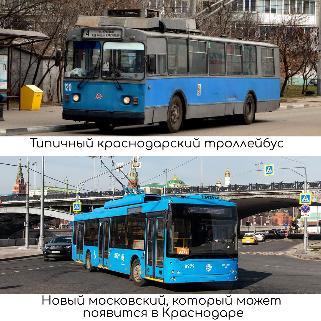 Пишет член команды Краснодар 2020 Марина Репещук: "Как известно, Москва сейчас переходит на использование электробусов и фактически полностью ликвидирует городскую тролейбусную сеть( очень дорогое и нерациональное решение мэра Собянин). По этой причине столица бесплатно раздаёт свой парк троллейбусов в регионы (нужно только заплатить за их перегонку). Многие города, такие как Ростов-на-Дону, Балаково, Тула, Черкесск, Рязань, Саратов, Томск уже воспользовались этой возможностью. На мой взгляд, разумно было бы и нам попробовать обновить троллейбусный парк за относительно небольшие деньги. На данный момент в Москве ещё остаётся не малое количество хороших троллейбусов выпуска 2009 – 2018 года. Троллейбусы СВАРЗ-МАЗ 6275 поставки 2018 года - практически новые, отвечают всем современным требованиям. Они низкопольные, оборудованы кондиционерами. В апреле месяце я напправила письмо губернатору с предложением отправить запрос в Москву с просьбой передать троллейбусы в Краснодар. Посколь