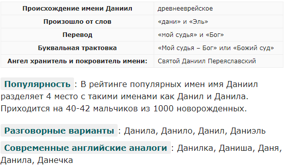 Мужское имя Даниил имеет древнееврейское происхождение. Было образовано от слов «дани» - «мой судья», а также «эль» - Господь. Имеет трактовку «Божий суд» или же «Бог – мой судья». Сегодня начинает пользоваться спросом среди русскоязычного населения, вместо традиционной укорочено формы Данил. Значение имени наделяет носителя массой положительных качеств характера. Даниил, как правило, это добродушный и спокойный, приветливый и активный, позитивный и впечатлительный, открытый и оптимистичный человек. Носители имени Даниил стараются всегда поступать правильно и со всеми поддерживать хорошие приятельские отношения. СМОТРИТЕ ВИДЕО - ПОДРОБНЕЕ ТУТ Источник - Значение имени Даниил: карма, характер и судьба