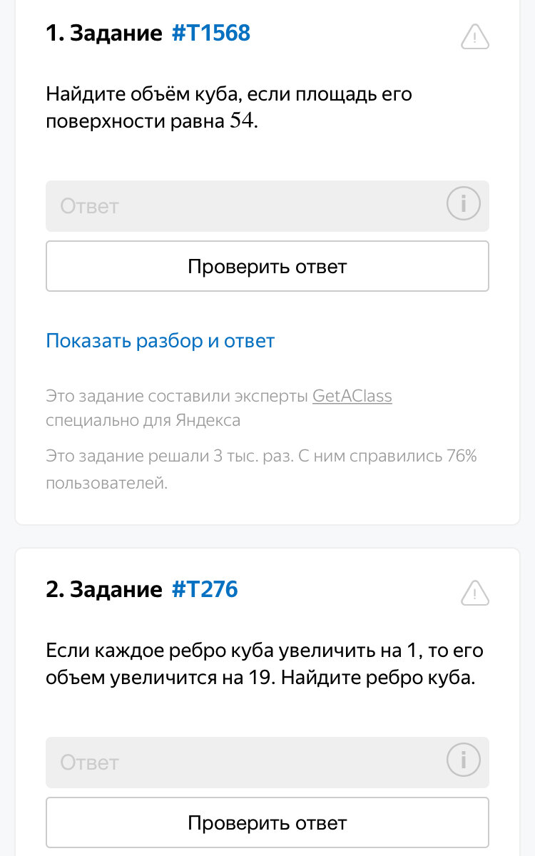 Перед началом обращусь к вам с просьбой. Я пытаюсь помочь вам, а вы помогайте мне :) Обязательно дочитывайте до конца, подписывайтесь на канал, задавайте свои вопросы по математике в комментарии или в соцсетях по ссылкам на канале. Помогайте мне продвинуть канал :) Разберём теперь задачу с кубом. Это намного проще, разберём решение двух задачек. Формула всего одна: V=a^3. В первой задачке нам известна площадь всей поверхности куба. Поверхность куба состоит из 6 квадратов. Площадь их равна стороне в квадрате. Раз их шесть, значит площадь всей поверхности будет равна 6а^2. И по условию равна 54. Из этого мы можем найти сторону а. Находим , что она равна 3. Далее мы можем найти объём куба. Вторая задачка. Из её условия узнаем, что при увеличение ребра куба на 1, то есть а+1, объём увеличится на 19. Получаем уравнение (а+1)^3=а^3+19. Осталось его решить и найти сторону куба :) Записывайтесь на семинар по базе ЕГЭ Успейте записаться на интенсив ОГЭ ↓ ↓ ↓ ↓ ↓