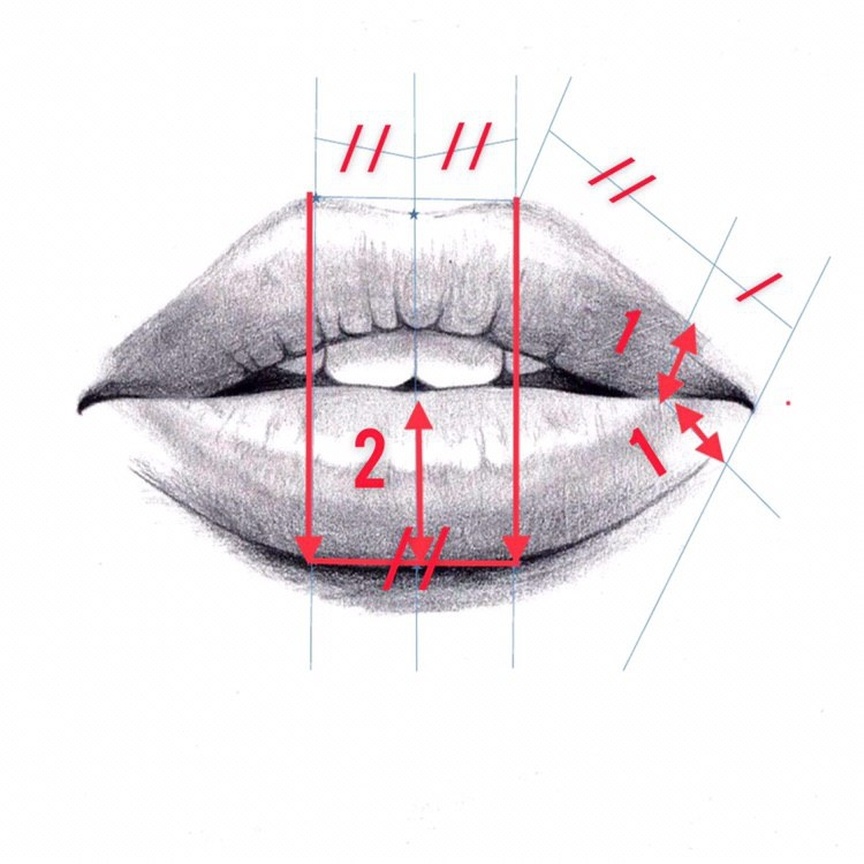 3. Соотношение самой широкой части нижней губы к ширине губ в уголках рта составляет 2:1.