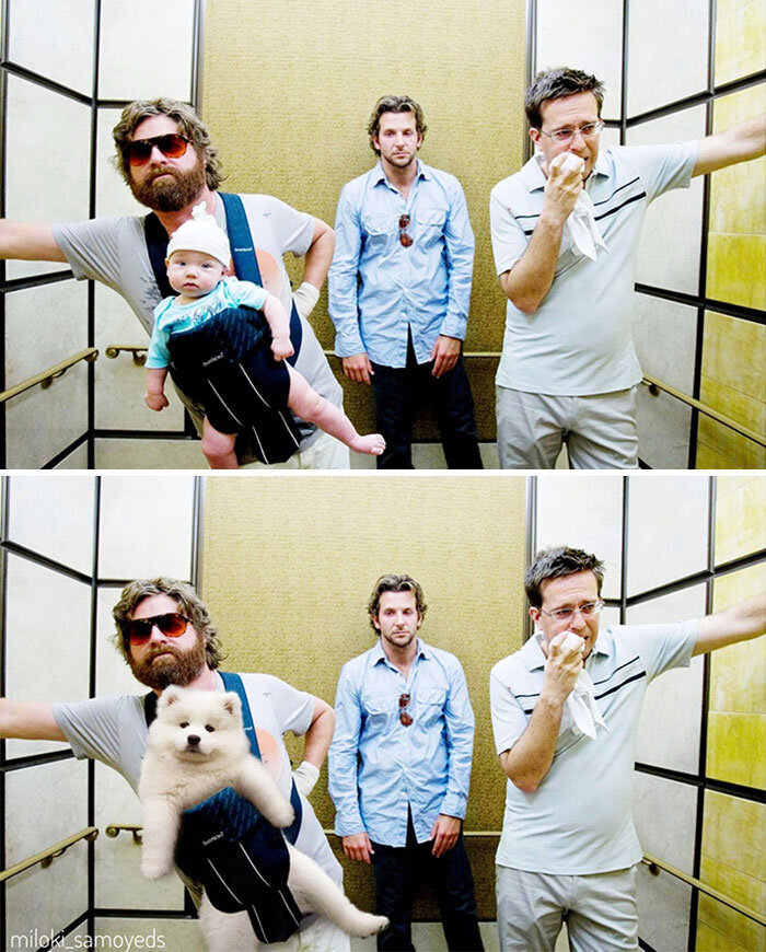 Сидя на карантине, Алиса Го решила натренировать свои навыки работы с Photoshop. При этом девушка подошла к задаче креативно: две её эскимосские лайки Самми и Полли прекрасно подошли на роли дублёров известных актёров. Алиса начинала этот эксперимент как шутку, но теперь у её собак тысячи поклонников в Instagram, которые требуют продолжения. "Мальчишник в Вегасе" мог стать ещё смешнее Лучший друг человека Индиана Джонс и собачья судьба У тебя тёплые руки, а у меня - лапки Это твоё королевство, Аполлон, кроме тех носков Сила и честь, отвага и шерсть! I'll be Gav! Лучше сидеть в корзине, чем бежать рядом Да пребудет с тобой ласка