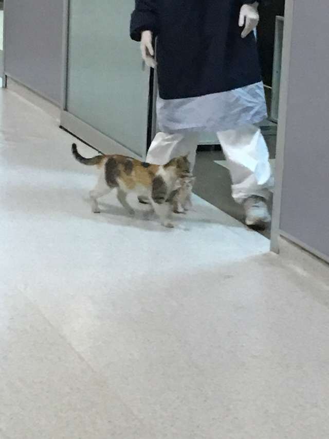 Это был обычный день в больнице Стамбула, когда вошел необычный пациент. Бродячая кошка зашла в больничный коридор, держа котенка во рту. Мерве Озкан находилась в холле в ожидании своего отца, когда увидела необычного пациента. "Я думаю, что это была кошка, которую сотрудники уже знают и были люди, которые видели ее там раньше ", - говорит Мерве. К счастью, с кошкой и котенком было все в порядке. Она просто пошла в больницу, чтобы получить немного молока и объятий. Мерве удалось запечатлеть несколько фотографий кошки с котенком, и она опубликовала их в Twitter. Фотографии стали очень популярными! В Турции много бездомных кошек, которых кормят местные общины. Поскольку рестораны закрыты из-за карантина, бездомные животные пытаются добыть еду. Иногда вот таким способом! Нам всем нелегко в этот сложный период самоизоляции и карантина, и если вы видите бездомное животное - пожалуйста, помогите ему! Ведь им сейчас тяжелее, чем нам.