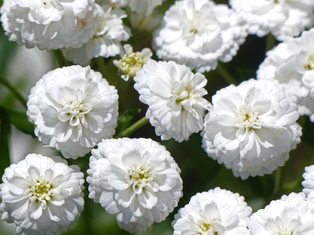 Тысячелистник жемчужина - многолетнее растение, совсем неприхотливое, не требующее большого внимания при его выращивании. Имеет небольшие белоснежные цветки махровой формы. Изобилие цветков делает это растение похожим на белоснежное покрывало. Словно белая фата слетела с головы невесты и приземлилась на вашей клумбе.