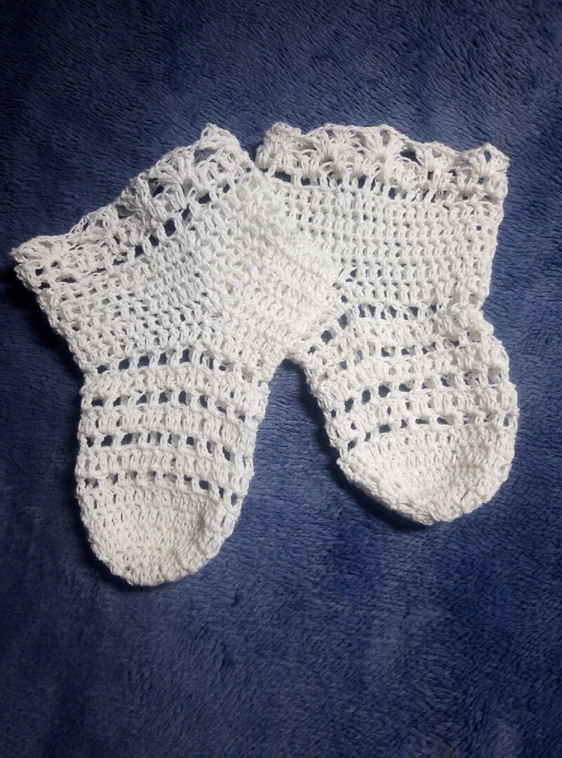 Для вязания этих носочков подойдёт хлопок, лён и т.д. Вязать будем крючком №1,5. Начинаем вязать с мыска носочка. Набираем цепочку из 6 возд. петель и замыкаем в кольцо. Затем ввязываем в это кольцо 12 ст.с/н. Далее вяжем по схеме. После того как связали по схеме, начинаем вязать по кругу столбиками с/н, чередуя 1 ряд филейной сетки (1 ст. с/н, возд. п., 1 ст. с/н., возд. п. и т.д.) и 1 ряд ст. с/н. Повторять эти чередования надо 4 раза. Теперь вяжем пяточку. Для этого надо отсчитать 18 петель и вязать на этих петлях 6 рядов ст. с/н. Затем сложим пяточку и выполним шов. Далее будем вязать ст. с/н по всей окружности носочка. Вяжем 4 ряда, а затем 1 ряд филейной сеткой и 1 ряд ст.с/н. Закончить вязание можно каймой по схеме 2 либо любой другой.