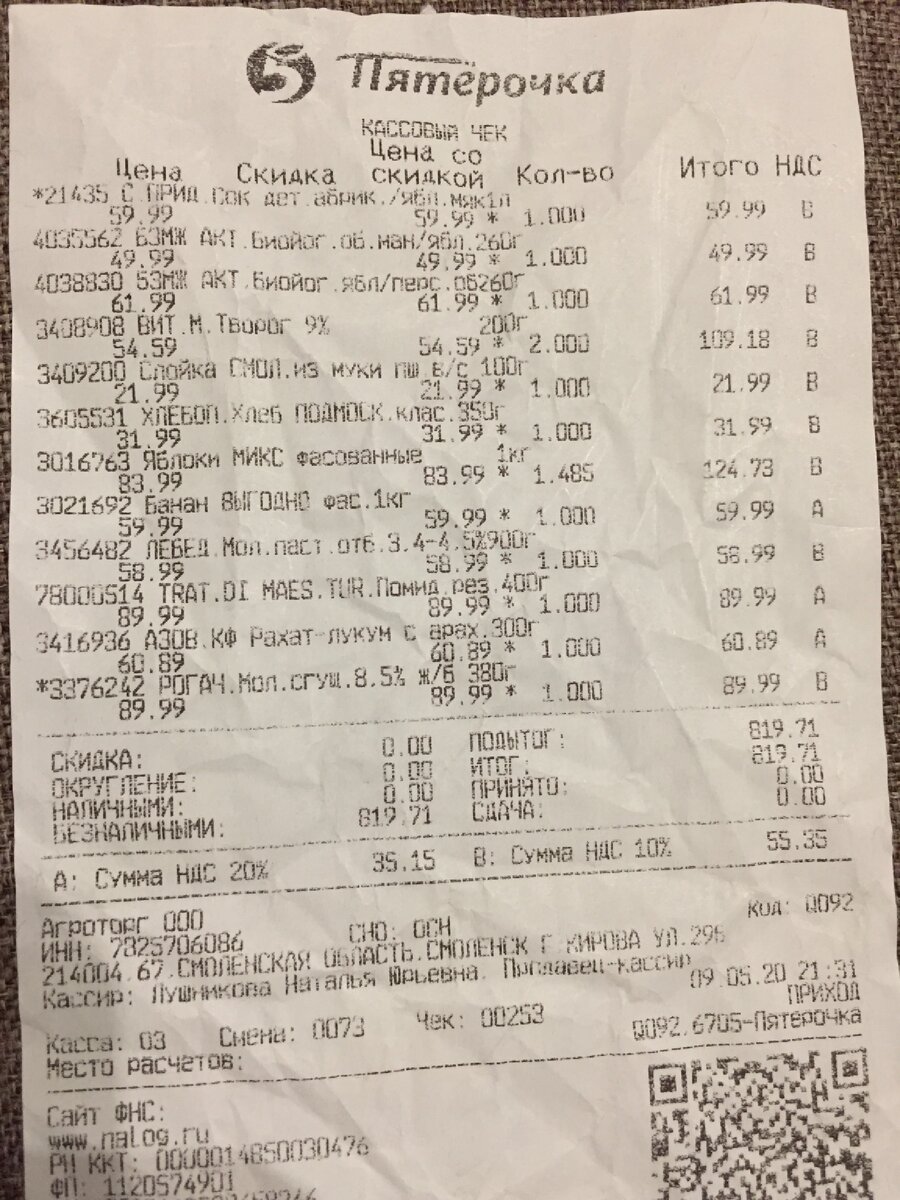 Сегодня пошла закупаться продуктами в пятерочку. Редко хожу в этот магазин. Но! может я удачно зашла или там всегда акции, но получилась хорошая покупка продуктов. Я купила сок абрикосовый (САДЫ ПРИДОНЬЯ), йогурт "Активия"разных вкусов: манго и яблоко, яблоко и персик, творог, слойку "Смоленская", яблоки (1, 485 кг) и бананы (1кг), молоко "Лебедянь", Рахат лукум Азовский и сгущенное молоко "Рогачев". Ниже приложу фотографию чека Делитесь своими удачными покупками в различных магазинах! Мне будет интересно почитать. Недавно писала статью, где рассказала о брюках из фикс прайса. Так вот! Брюки действительно хорошие, мне понравились, ткань за такие деньги нормальная, но выйдя в них на улицу, я заметила, что они очень просвечиваются. В итоге носить их можно только дома или на даче. Спасибо, что дочитали до конца)😊 Ставьте ЛАЙК👍