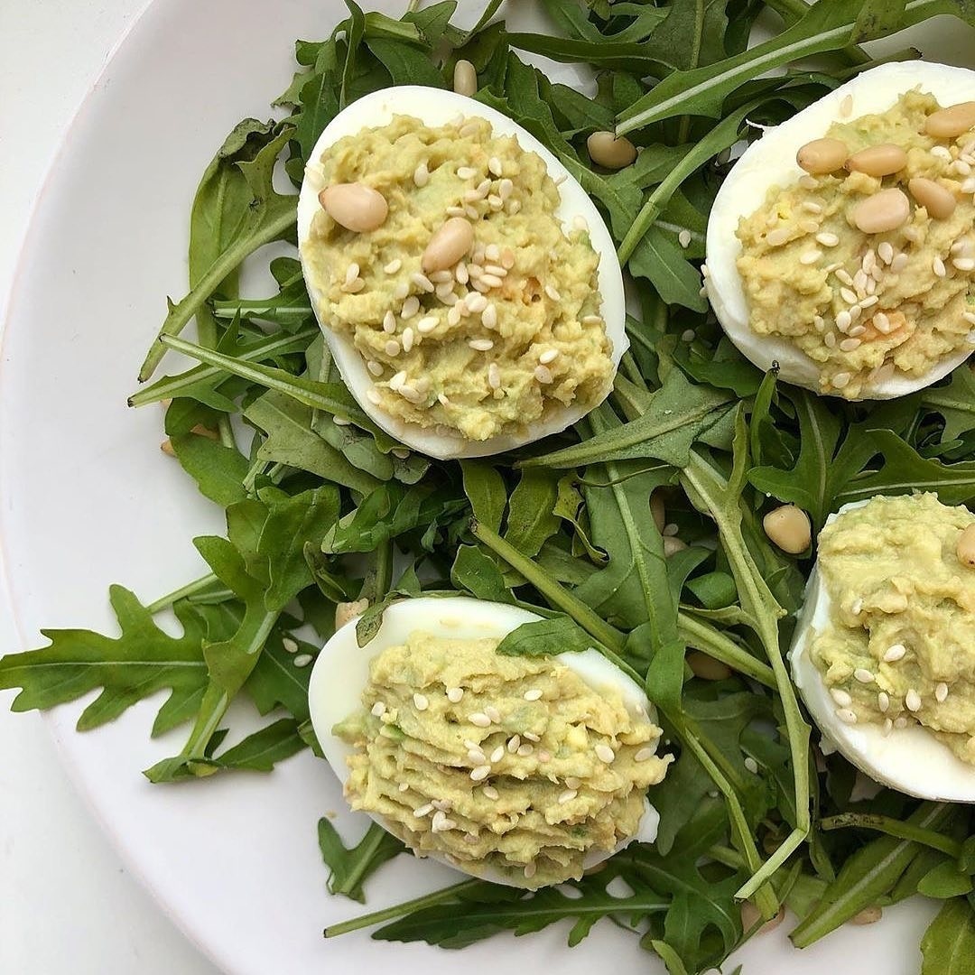Сохраните себе идею перекуса, легкого ужина, закуски к столу - это ооочень вкусно, ооочень быстро и ооооочень сытно! ✅ Яйцо 2 шт ✅ Авокадо 70 гр ✅ соль ✅ лимонный сок ✅ зелень (руккола/шпинат/салатная смесь) ✅ кедровые орешки/кунжут/семечки 5гр Яйца отвариваем вкрутую, остужаем. Разрезаем напополам. Делаем в начинку пасту: желтки разминаем с авокадо, лимонным соком и солью и выкладываем в белки. Посыпаем сверху кунжутом или семечками или кедровыми орешками и выкладываем на зелень (руккола или шпинат или салатная смесь), заправленную оливковым маслом (1чл). Калорийность всей этой красоты 360ккал 13/31/6