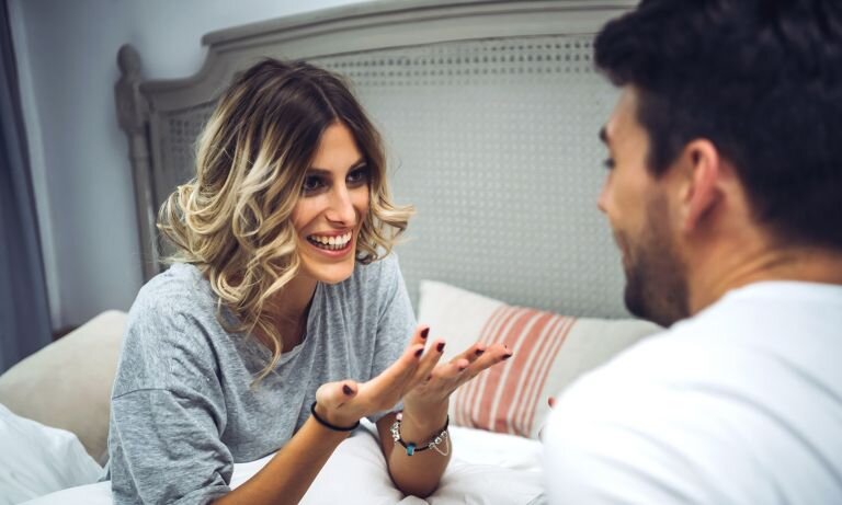 Молодая женщина сидит на кровати и улыбается, когда она жестикулирует в сторону своего партнера.