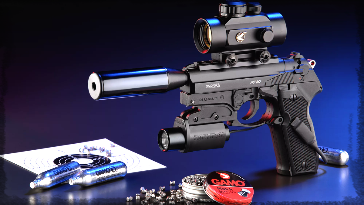 Нашел надежный пистолет для бывалых стрелков, с таким можно в тир и на соревнования. Gamo PT-80 Tactical Одна из немногих компаний которая производит свои продукты не в Тайване или Турции, а в Испании, благодаря этому и славится своим качеством изделий. За основу взят боевой прототип пистолета Beretta M8000, в комплекте идет фальшглушитель, фонарь тактический 35 Lumen, прицел коллиматорный 30 mm и магазин-барабан. Источник энергии - сжатый баллон с газом, в магазин заряжаются пули 4,5 mm в количестве 8 штук, с новым баллоном пуля берет разгон до 120 м\секунду. Для установки гаджетов имеются две планки - Weaver и Picatinny. Вес без обвесов и глушителя 560 грамм, в длину 180 мм, из пластиковых элементов можно найти только рукоять, рама и затвор отлиты из хороших сплавов металла. Одного баллона хватает на 70+ выстрелов, полностью весь магазин можно выстрелить за 1,5 секунды, идеальный друг для тренировок и оттачивания навыков. Выбирают такой пистолет чаще всего любители или опытные люди