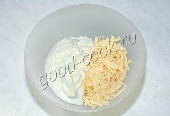 Отложить примерно 50 граммов сыра для посыпки, остальной смешать со сметаной. Посолить. При желании для аромата можно добавить небольшой зубчик чеснока, пропущенный через пресс, или щепотку сухого чеснока.