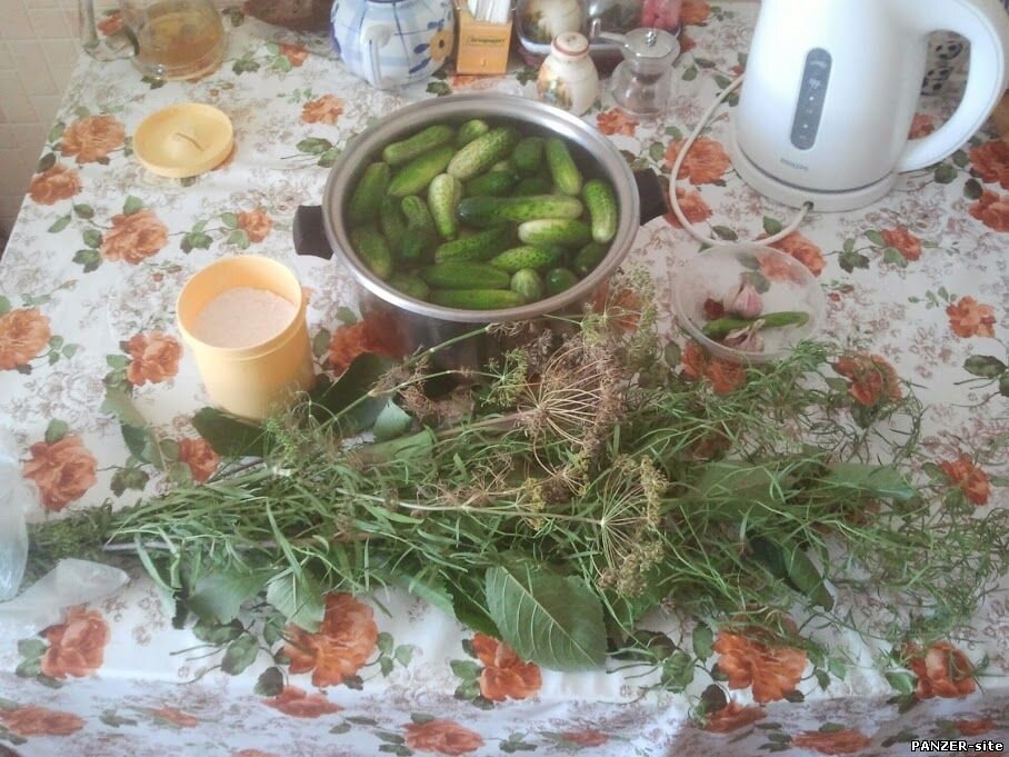Недавно я рассказывал за кабачковую пору, а сегодня расскажу за пору огуречную! Огурцы на базаре продаются почти уже за копейки и покупаем мы их постоянно, но тут, шел как-то я с работы, и вижу на «Курортном базаре» продаются огурчики – небольшие, крепенькие, зеленые. Свежих вроде как не хочется, а вот соленых… Но засолки ждать долго, а вот малосольные сделать довольно не сложно. Короче, решил я сварганить малосольных огурчиков. Купил я с полтора килограмма огурцов, там же прикупил «букет» с разной травой – укроп зонтиками, ветка вишни, лист хрена, ветки тархуна. Чеснок и острый перец уже был в наличии. Ну а за банкой и водой и вовсе дело не стало. Соль в доме тоже была в наличии. Огурцы, как видно с фотографии, я предварительно вымочил часов 12. Это чтобы горечь ушла, если есть таковая.