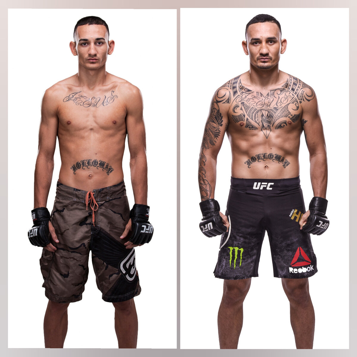 Плечи, руки и грудь Холлоуэя украшены самоанскими узорами – так Макс подчеркивает свое происхождение. Надпись «Иисус» на груди выдает в нем религиозного человека. Два крыла на спине – ангельское и демонское – символизируют двойственность натуры бойца. Среди узоров на его правой руке можно прочитать слово «Благословенный» – прозвище бойца. Не любит покидать Гавайи и продолжает там тренироваться Сегодня бойцы стремятся тренироваться в лучших спортивных залах мира, ради этого они готовы покинуть свой дом и отправиться за тысячи километров от него, чтобы получить возможность тренироваться с лучшими партнерами у лучших тренеров. Самые известные залы сейчас находятся в континентальной части США. Однако Их зал нельзя назвать элитным. Самый знаменитый гавайский боец, член Зала славы UFC Би Джей Пенн, как и многие жители Гавайев, постоянно посещает материк: к своим последним боям он готовился в Jackson-Wink. Холлоуэй доказывает, что внутренние качества бойца важнее места жительства. Всё