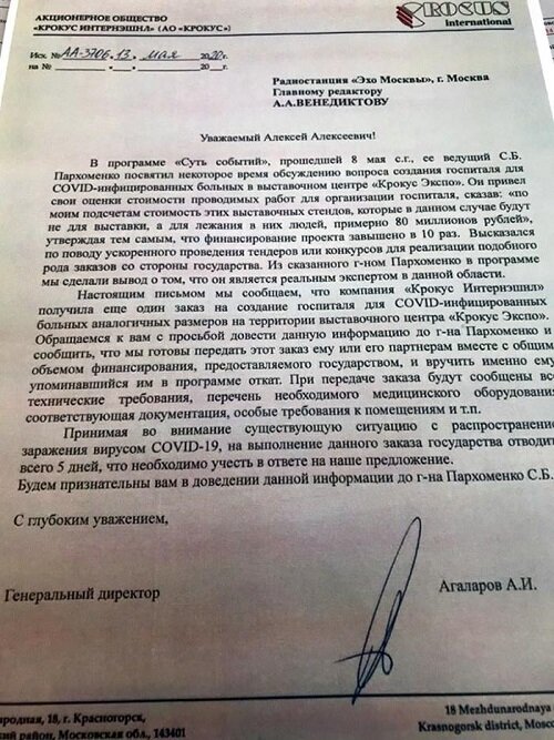 Намедни на «Эхе» Сергей Пархоменко обвинил владельца «Крокус Экспо» Араза Агаларова в коррупционном контракте с подмосковными властями на оборудование изолятора для больных COVID-19.