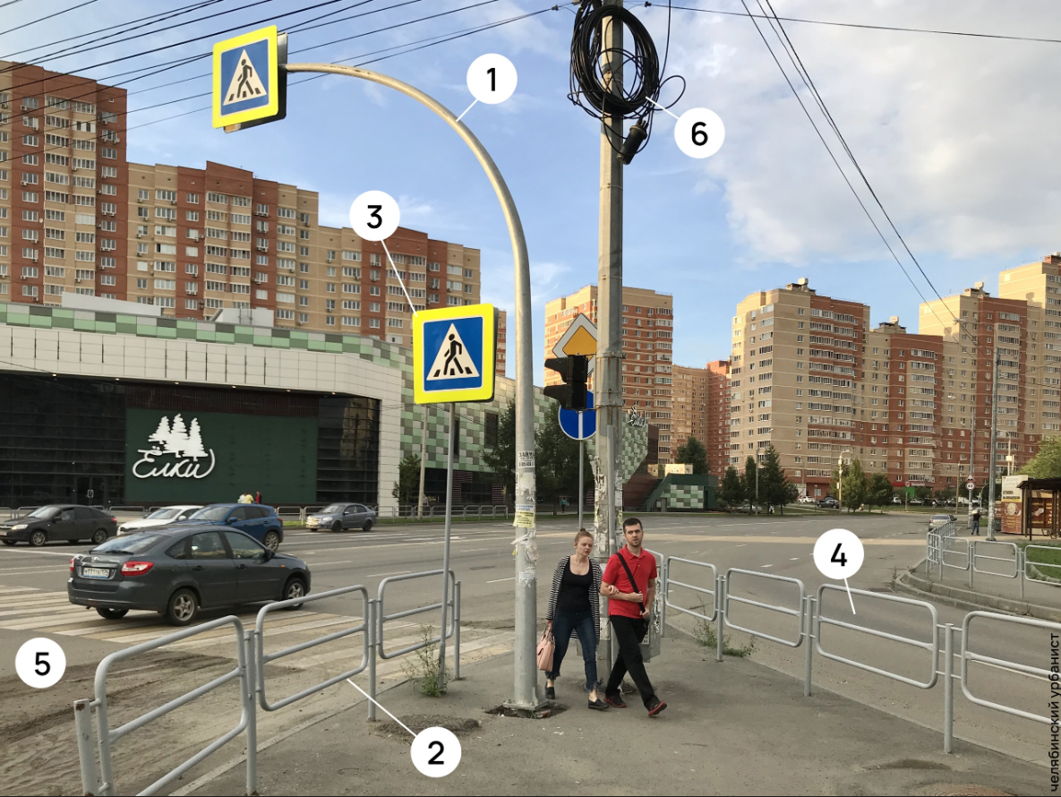 1. Дублёры знака перехода обязательны с 2017 года на каждом перекрёстке от 2+2 полос. На самом деле абсолютно бесполезны на регулируемых перекрёстках. Каждый столб стоит около 110 000 руб. 2. Ограждения на 50 метров в каждую сторону от любого перехода. Обязательны с 2017 года. Каждая секция — около 4500 руб. 3. Кислотные рамки вокруг знака перехода. Обязательны с 2017 года. Каждый парный знак — 5500 руб. 4. Правые свороты во время «дорожной революции». Двухполосные, чтобы можно было пустить грузовик в дрифте. Ширина ненормативная, но гаишников всё устраивает. В большинстве случаев не нужны, делают город проавтомобильным. 5. Четырёхполосный въезд с двух полос выезда. Логика нулевая. Расширяет улицу, удлинняет фазу перехода. Ровно половина асфальта — лишняя. 6. Склад проводов, по никому неизвестной причине размещаемый на городских столбах. Я бы мог всё исправить и спроектировать красивые улицы, но мне мешают: