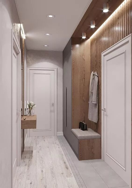 Освещение должно помочь рассмотреть себя в зеркале, найти необходимые принадлежности, вещи, в том числе размещенные в шкафу. Автоматика позволит сэкономить время и сделать пребывание в помещение комфортным. Отметим, что прихожие обычно имеют прямоугольную, нередко вытянутую форму. В многоэтажных домах старой постройки приходится сталкиваться с достаточно тесными холлами. Выбор трековых led светильников в коридоре позволит «исправить» пропорции пространства, сделать его более объемным и просторным.