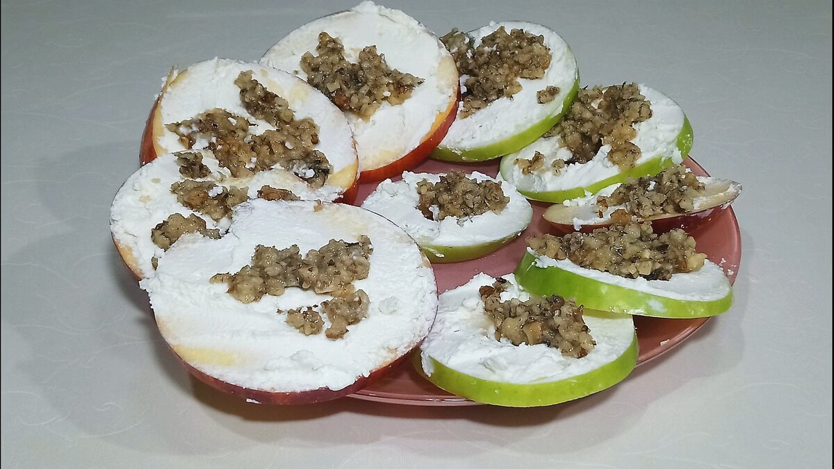 5. Выкладываем яблоки на тарелку и смазываем лимонным соком. чтобы они не потемнели. 6. Сверху выкладываем творожный сыр, а затем по одной чайной ложке орехово-медовой начинки. Готовится такая закуска очень быстро, поэтому можно отложить ее приготовление на самый последний момент — минут за 10-15 до прихода гостей. Если планируете баловать их вином, такой вариант канапе будет особенно актуален. Приятного аппетита! Ставьте лайки и Подписывайтесь на канал