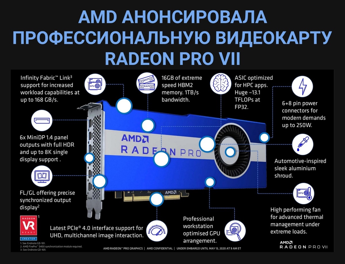 В основе AMD Radeon Pro VII лежит урезанная версия 7-нм GPU Vega 20 с 3840 потоковыми процессорами. Видеобуфер представлен 16 ГБ многослойной памяти HBM2 с поддержкой ECC, 4096-разрядной шиной и пропускной способностью 1 Тбайт/с. Грубая вычислительная мощность ускорителя достигает 13,1 Тфлопс в операциях FP32 и 6,5 Тфлопс в FP64. Судя по этим цифрам, рабочая частота GPU находится у отметки 1,7 ГГц.