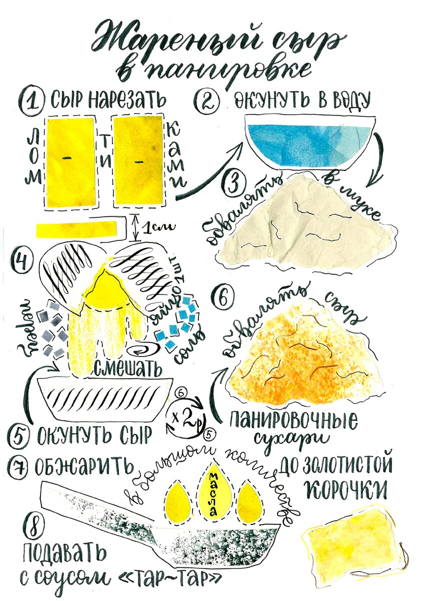 Технология приготовления: 1. Сыр нарезать ломтиками толщиной 1 см. 2. Сыр обмакнуть в воде. 3. Сыр обмакнуть в муке (тщательно со всех сторон). 4. Яйцо смешать с солью и перцем до однородной консистенции (тщательно со всех сторон).