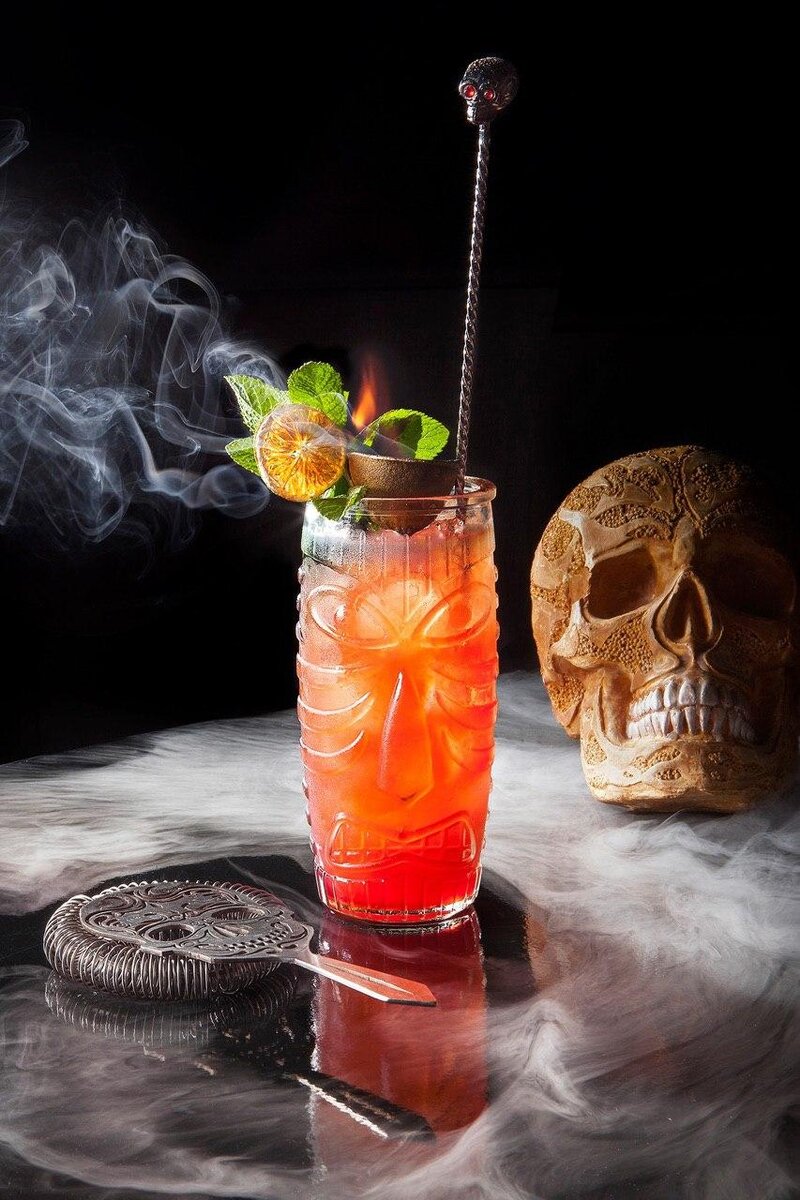 Крепкий, тропический напиток на основе ромов, соков ананаса и апельсина. С нотами ягод. Относится к категории "Тики" и подаётся с оригинальным горящим украшением. Инвентарь: бокал - тики или на что хватит фантазии, главное чтобы поместился/ шейкер/ стрейнер/ джиггер/ трубочки/ сквизер/ зажигалка. Тики бокалы изначально делали в виде идолов- истуканов с огромными треугольными лицами и маленьким телом. Им поклонялись много веков назад жители Полинезии и сейчас многие жители Новой Зеландии и Гавайев верят в их силу. Сейчас бокалы делают во многих уголках планеты, в виде животных и различных героев современности. Состав: ром белый - 20 мл/ ром золотой - 20 мл/ ром тёмный - 20 мл/