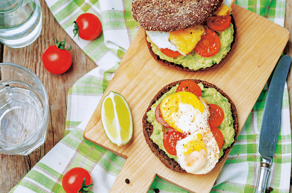Ингредиенты: Способ приготовления: Авокадо вымыть, очистить и удалить косточку. Чеснок очистить и пропустить через пресс. Мякоть авокадо размять вилкой, перемешать с чесноком и лимонным соком. Посолить и поперчить по вкусу. На оливковом масле поджарить яйца. Цельнозерновую булочку разрезать на половинки и слегка подрумянить в тостере или на сухой сковороде срезом вниз. Дать немного остыть. Ингредиенты: Способ приготовления: Авокадо вымыть, очистить и удалить косточку. Чеснок очистить и пропустить через пресс. Мякоть авокадо размять вилкой, перемешать с чесноком и лимонным соком. Посолить и поперчить по вкусу. На оливковом масле поджарить яйца. Цельнозерновую булочку разрезать на половинки и слегка подрумянить в тостере или на сухой сковороде срезом вниз. Дать немного остыть. На половинки булочки выложить получившуюся массу из авокадо и разровнять. Помидоры черри вымыть, обсушить, разрезать на половинки и выложить сверху. Следующим слоем выкладываем жаренные яйца по два на каждый сэнд