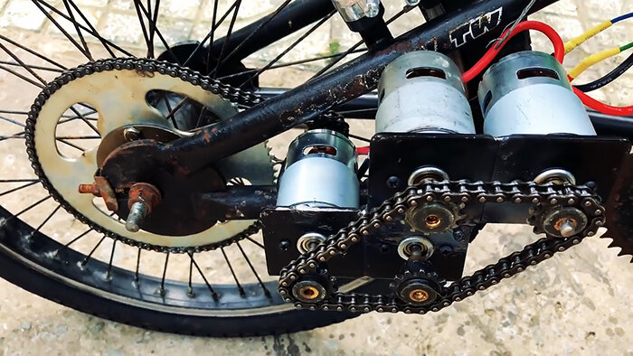 После этого они соединяются общей цепью. В результате все двигатели будут создавать крутящий момент вместе, и посредством вала первого мотора передавать усилие на заднее колесо. При этом педали смогут выполнять только функцию упоров для ног, так как цепь к ним не подводиться.