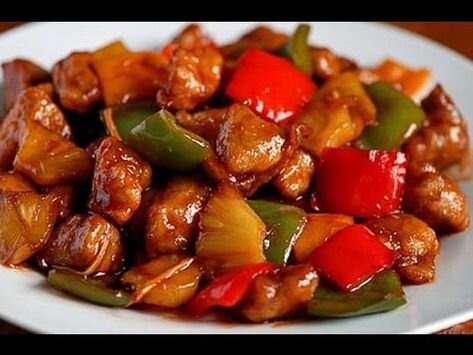 Это вкусное, сытное и простое в приготовлении блюдо. Его вполне можно приготовить самостоятельно у себя на кухне, несмотря на достаточно длинный список ингредиентов. Сочные кусочки курицы в кисло-сладком соусе с овощами! В это блюдо невозможно не влюбиться. Ингредиенты: · Куриные грудки – 900гр · Перец болгарский – 1-2 штуки · Ананас консервированный (кубики) – 1 банка · Лук – 1 головка · Томатная паста – 3 ст.л. · Соевый соус – 4-5 ст.л. · Крахмал – 3 ст.л. · Сахар – 1 ч.л. · Растительное масло · Соль, перец по вкусу · Молотый имбирь - 1 ч.л. · Зелень ЭТАПЫ ПРИГОТОВЛЕНИЯ: 1. Грудку нарезаем крупными кубиками и выкладываем в глубокое блюдо. 2. В отдельную тарелку добавляем соевый соус, крахмал, перец и соль. Взбиваем венчиком или вилкой до однородной массы. Обязательно проверяем чтобы крахмал хорошенько растворился. 3. Отправляем заправку к нарезанной грудке и перемешиваем. Оставляем мариноваться и переходим к следующему этапу. 4. Крупными кубиками нарезаем болгарский перец и