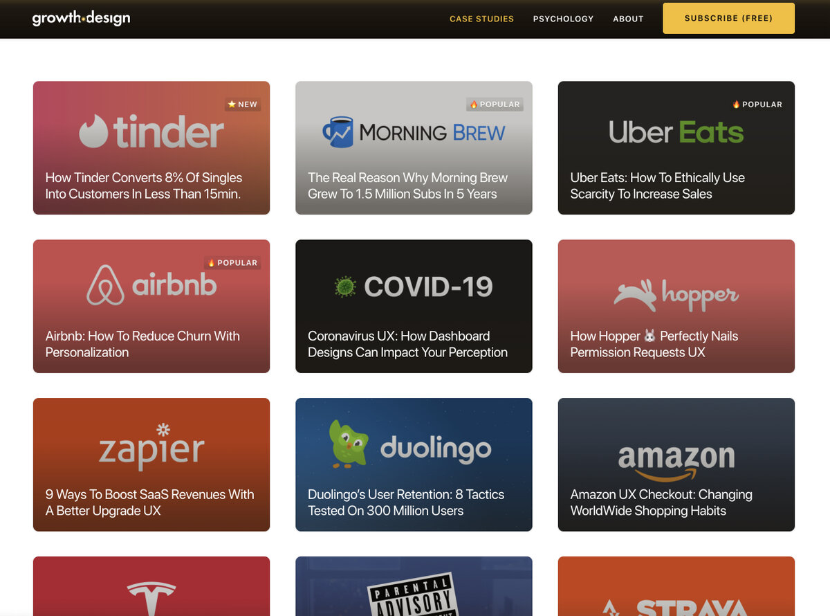 Growth.design — сервис, призванный рассказать о важности интерфейсных решений на примере кейсов известных компаний по типу Эйр БиЭнБи или Тиндер. Правда не со всем я согласен. Есть спорные моменты, которые не уберёшь из интерфейса. Оригинал поста в моём канале https://t.me/dgtlist/2501