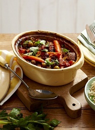 Время готовки - 1 ч количество персон - 4 чел Уровень сложности - Легко Кухня - Международная Ингредиенты 1½ столовые ложки оливкового масла 750 г говяжьего филе, порезанного кусочками ¼ стакана муки 1 стебель лука-порея (белая часть), нарезанный ломтиками 1 зубчик чеснока, измельченный 1 столовая ложка кумина, молотого 2 чайные ложки имбиря, молотого 2 стакана говяжьего бульона 6 морковок, порезанных брусочками 400 г томатов, консервированных в собственном соку, порезанных кубиками ½ стакана фаршированных оливок сок и цедра 1 лимона ½ стакана зелени петрушки, порубленной ½ стакана зелени кинзы, порубленной (по желанию) Способ приготовления : 1. Разогреть 1 столовую ложку масла в большой глубокой сковороде или гусятнице на большом огне. Обвалять мясо в муке с добавлением соли и перца. Обжаривать, помешивая, 2-3 минуты, до слегка коричневого цвета. Переложить на блюдо. 2. Разогреть оставшееся масло в той же сковороде. Тушить лук-порей и чеснок 1-2 минуты. Добавить специи. Готовить, п