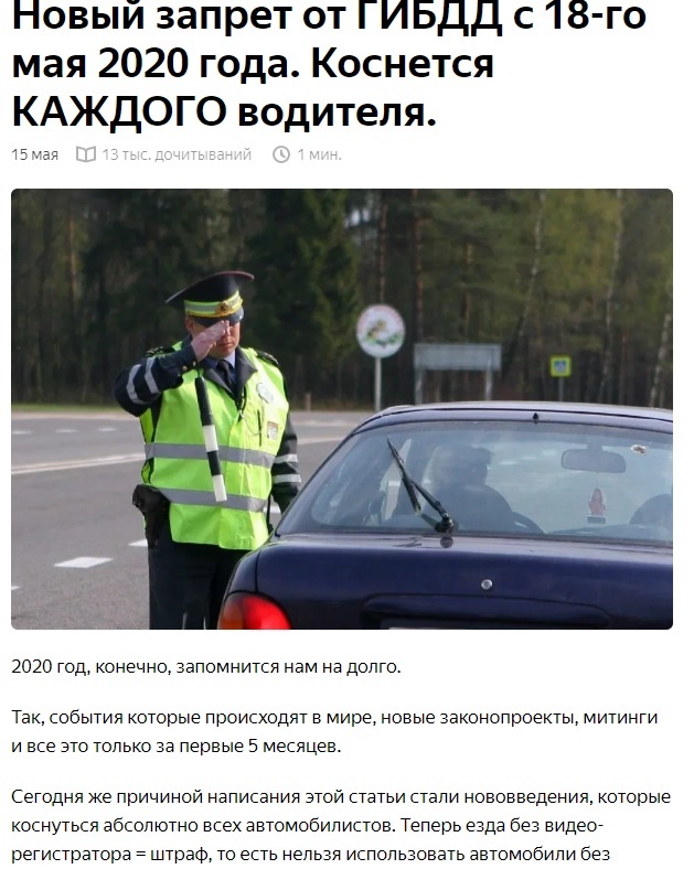 Сегодня искал что нибуть интересное на просторах интернета и наткнулся на такую статью Сам я начинающий автолюбитель, год назад получил права и пол года назад купил свой первый автомобиль. Видеорегистратор ещё не покупал т.к. живу в сельской месности и в город выбираюсь не часто. Но эта статья меня испугала. Начал я разбираться в этом вопросе и вот что обнаружил. На официальном сайте ГИБДД нашёл новость от 08.05.2020 года, где говорится - В последние дни в сети Интернет распространялась информация о том, что наличие видеорегистраторов в салоне автомобилей станет обязательным, а за их отсутствие будет предусмотрена административная ответственность... Госавтоинспекция сообщает, что изложенная в материале информация не соответствует действительности, требования к обязательному использованию видеорегистраторов в салонах автомобилей не вводились и не планируются. Оказывается такие статьи пишутся специально, чтобы люди покупали видеорегистратор и указывают где они взяли по дешёвке.