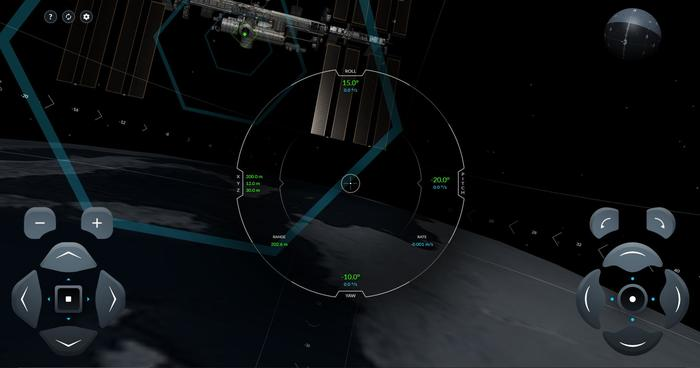 Как играть: 1) Значение каждого угла и координаты в момент касания со шлюзом должно быть не больше 0.2, а скорость -- меньше 0.080 м/с (поначалу можно разогнаться, но в конце скорость должна быть не больше данного значения) 2) На правом джойстике вы корректируете 3 угла корабля: поворот по крену (вращение по часовой-против часовой стрелки), тангажу (поворот вверх-вниз), рысканью (поворот влево-вправо) 3) На левом джойстике вы корректируете поступательное движение модуля: движение вперед-назад (кнопки "+" и "-"), влево-вправо, вверх-вниз 4) При нажатии на центр джойстика изменяется его чувствительность, т.е. выбирается, насколько большие шаги выполняют кнопки джойстика: грубо или тонко 5) Нужно попасть в зелёную точку 6) Синие цифры -- угловая скорость. "Rate" в правом нижнем углу -- скорость приближения к МКС. 7) Нужно учитывать, что движение происходит в космосе, сопротивления воздуха или трения нет, поэтому из-за инерции любая скорость движения или вращения будет сохраняться, пока