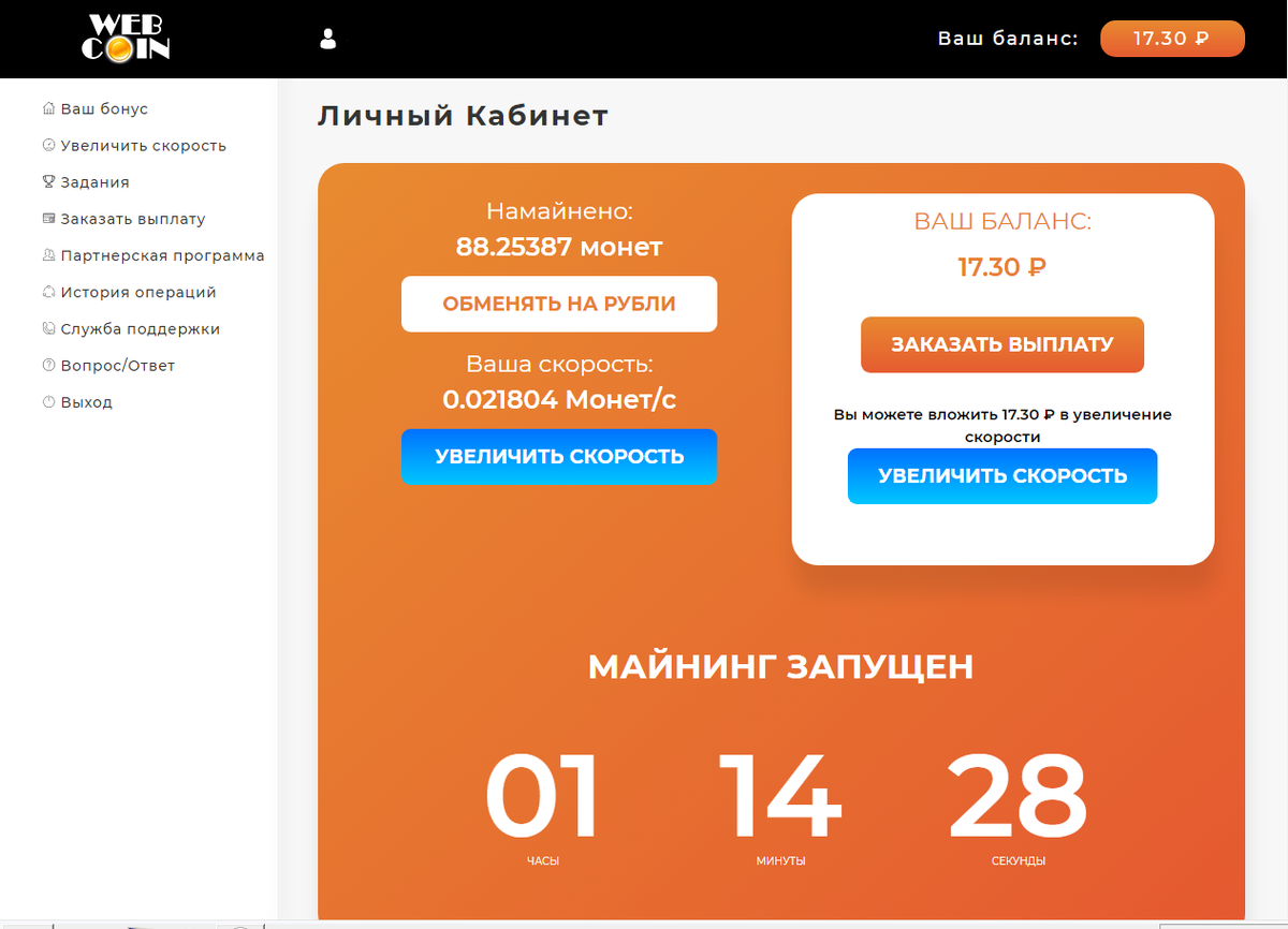 web coin даёт пассивный заработок? По стандарту, просматривая web coin, является весьма привлекательным сайтом. Как только заходим, нам в ту же секунду включают видео презентацию. Справа находится достаточно внушительная статистика. На момент обзора уже было: 54 351 человек, за 24 часа зарегистрировалось 466 человек, выплачено аж 12 344 321 рубль. Резерв проекта составляет около десяти миллионов. Это очень сильная сумма и говорит о том, что проект работает уже долго. Спускаясь ниже по сайту, нам рассказывают о простой регистрации. Вывод возможен на популярные электронные кошельки как Яндекс деньги, QIWI, PAYEER, WEBMONEY и банковские карты. Забрать деньги можно, начиная с двух рублей. Ещё существует такая функция как калькулятор прибыли, который предоставляет полное понимание, сколько выручки можно получить от вложенных средств. Рассчитывается прибыль от одного дня до шести месяцев. Как и во многих сейчас проектах, существует реферальная программа от 1 до 5%. Кто не знает, для чего она