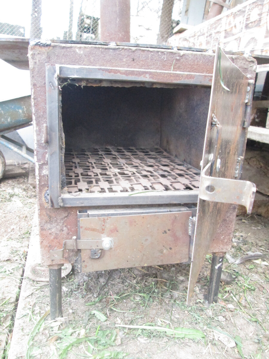 Здавали металлолом, кучу барохла. Получилось так, что обратно притащили, тоже с приёмки тоже барохло. Почти поменялись, херню на херню. Валялась там старая ржавая печка. Выкинул кто-то. Прикинул, пока сварка есть и железки. Подреставрирую, бабульке в огород пойдёт, и варить скотине, и коптильню ставить широкую (кстати коптильню варили с другом сами- потом будет описание). Дверки даже не шевелились. Срезал. Были отдельно сварены новые. Ножки из трубы и шайбы. Внутри уже дыры. Дрова провалятся. Во дворе от забора остались листы. Всё пригождается. Уголок, пруток, лист. Валялись два листа-выкинуть жалко. Приварено сверху –получилась ровная, большая поверхность. Любые кастрюли можно хоть что варить. Сбоку решено сделать из трубок втулки. Короче будут крепёжки. Сдвинул и не мешают. Раздвинул – положил железные поддоны и вот тебе –суши на них фрукты-продукты, ячмень поджаривай для браги и солода для самогона –вискаря. Да много чего нужно бывыет подсушить рядом с горяче
