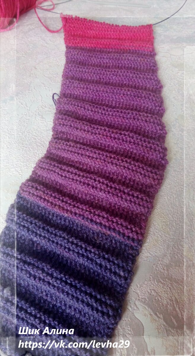 Чтобы не сбиться, записываю в блокнот полоски лицевой глади и изнаночных рядов, на 30-м см вязание достигло 100 рядов в высоту, я отметила это место маркером и начала на счетчике новый отсчет, т.к. подозреваю, что в бактусе будет несколько сотен рядов:)).